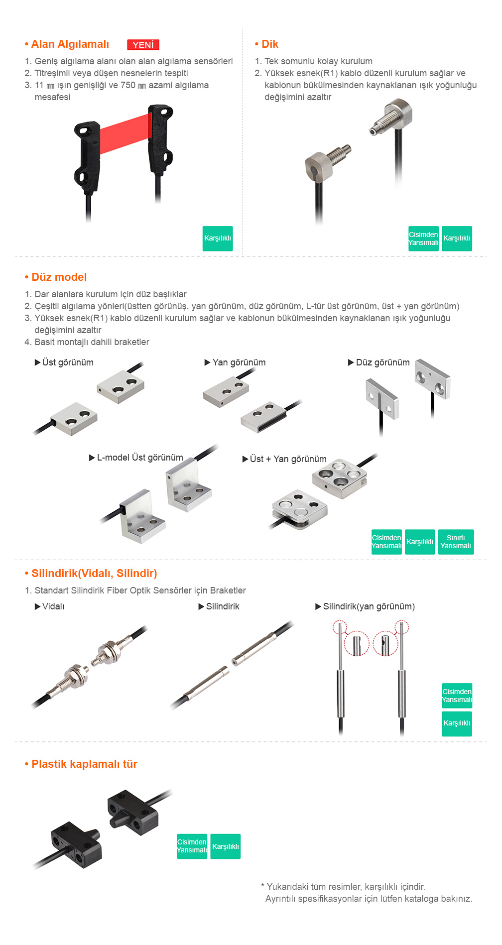 Autonics, geniş bir uygulama yelpazesinde algılama gereksinimlerine uyacak şekilde çeşitli fiber optik kablolar serisi sunmaktadır. FD / FT / FL / GD / GT serisi fiber optik kablolar, çeşitli kafa tiplerinde (iplik, silindirik, düz, dikey, plastik, alan tespiti), algılama yöntemleri (karşılıklı, cisimden yansımalı ve reflektörlü), kablo (standart, esnek, koaksiyal, kırılmaz, ısıya dayanıklı) ve algılama yönleri (düz, üst, yan, vb.).